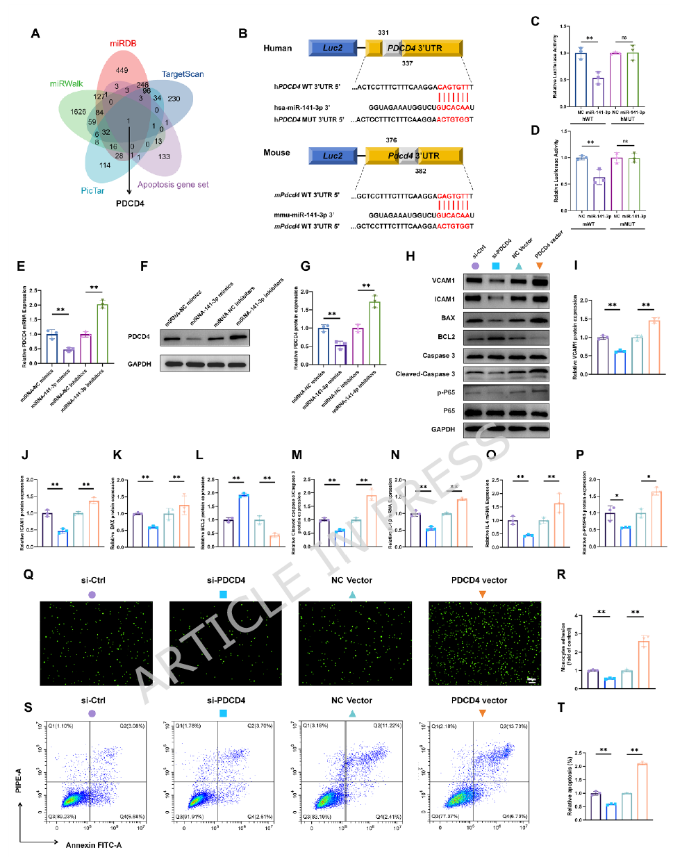 图3:程序性细胞死亡4参与微小RNA-141-3p对内皮细胞炎症和凋亡的调控