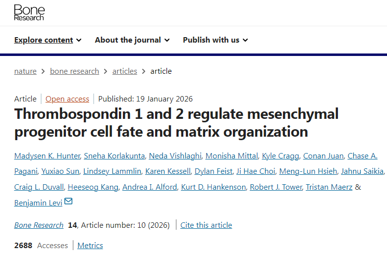 Hunter, M.K., Korlakunta, S., Vishlaghi, N. et al. Thrombospondin 1 and 2 regulate mesenchymal progenitor cell fate and matrix organization. Bone Res 14, 10 (2026). doi:10.1038/s41413-025-00493-2