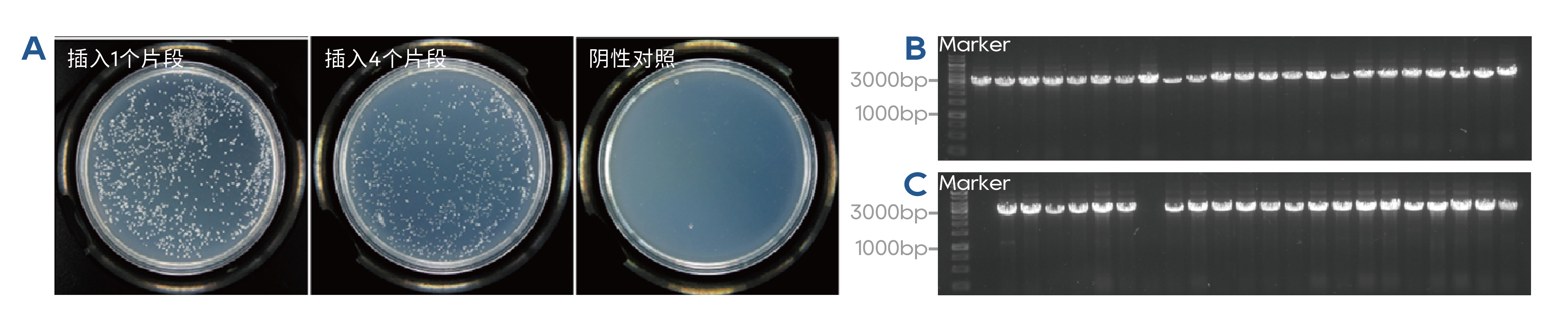 使用QuarCam Seamless Cloning Kit分别进行1个和4个片段的重组实验,结果显示可兼容一个或者多个目标片段的插入连接。(A)带有重组质粒的大肠杆菌细胞在抗性平板上的生长情况。(B)插入1个片段的菌落PCR琼脂糖凝胶电泳检测结果。(C)插入4个片段的菌落PCR琼脂糖凝胶电泳检测结果。