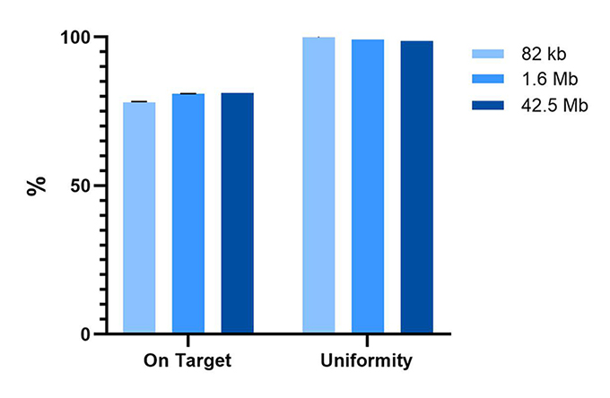 Using gDNA as a sample, an ultrasonic library (dynegene, NL1001) was created for hybrid capture testing of a single sample with different probes (82kb, 1.6Mb, 42.5Mb). The results show that the capture efficiency and uniformity are excellent across different panels.